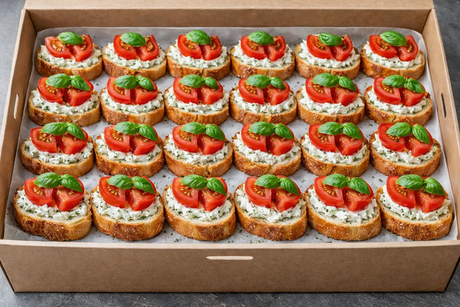 A beautifully uniform tray of 20 caprese bruschetta — each featuring a crispy toasted crostini base spread with a herbed cream cheese, topped with slices of ripe roma tomato and a fresh basil leaf.