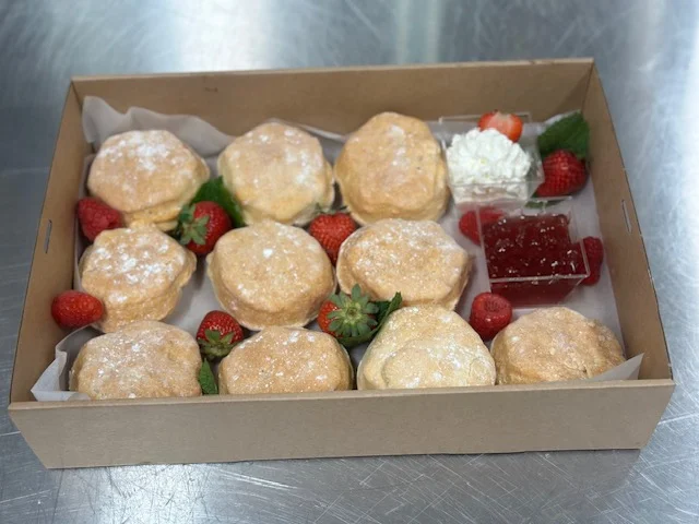 A charming box of 10 freshly baked, golden scones dusted with icing sugar, accompanied by a generous pot of house-made strawberry jam, a swirl of fresh whipped cream, and scattered with plump strawberries and raspberries.
